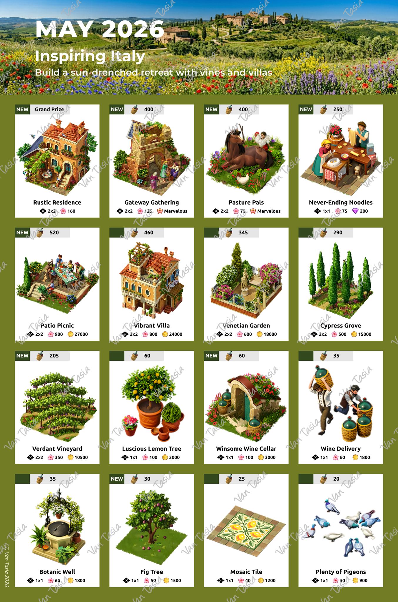 Every month there is a new set from which buildings, figures or items can be purchased