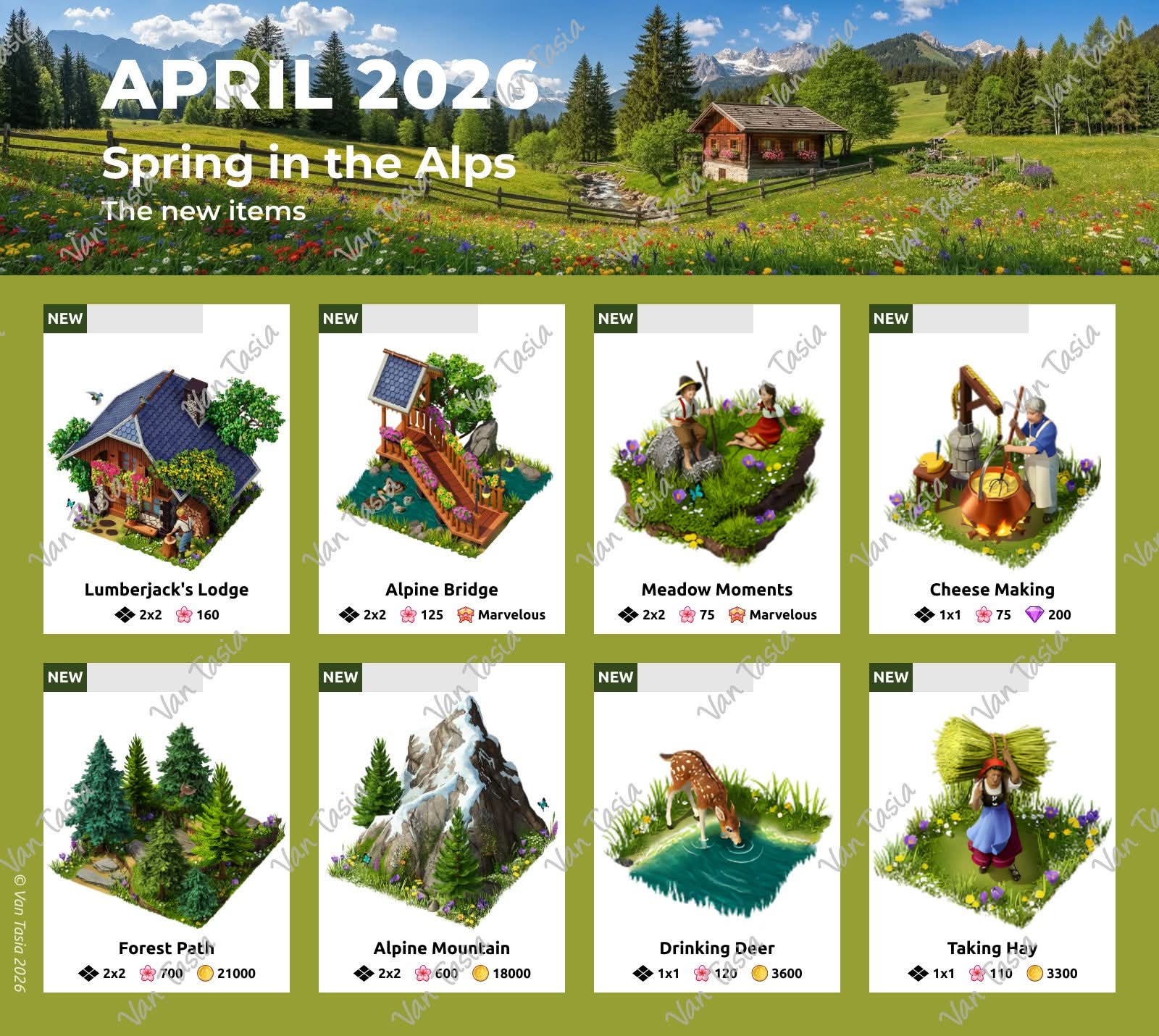 Every month there is a new set from which buildings, figures or items can be purchased