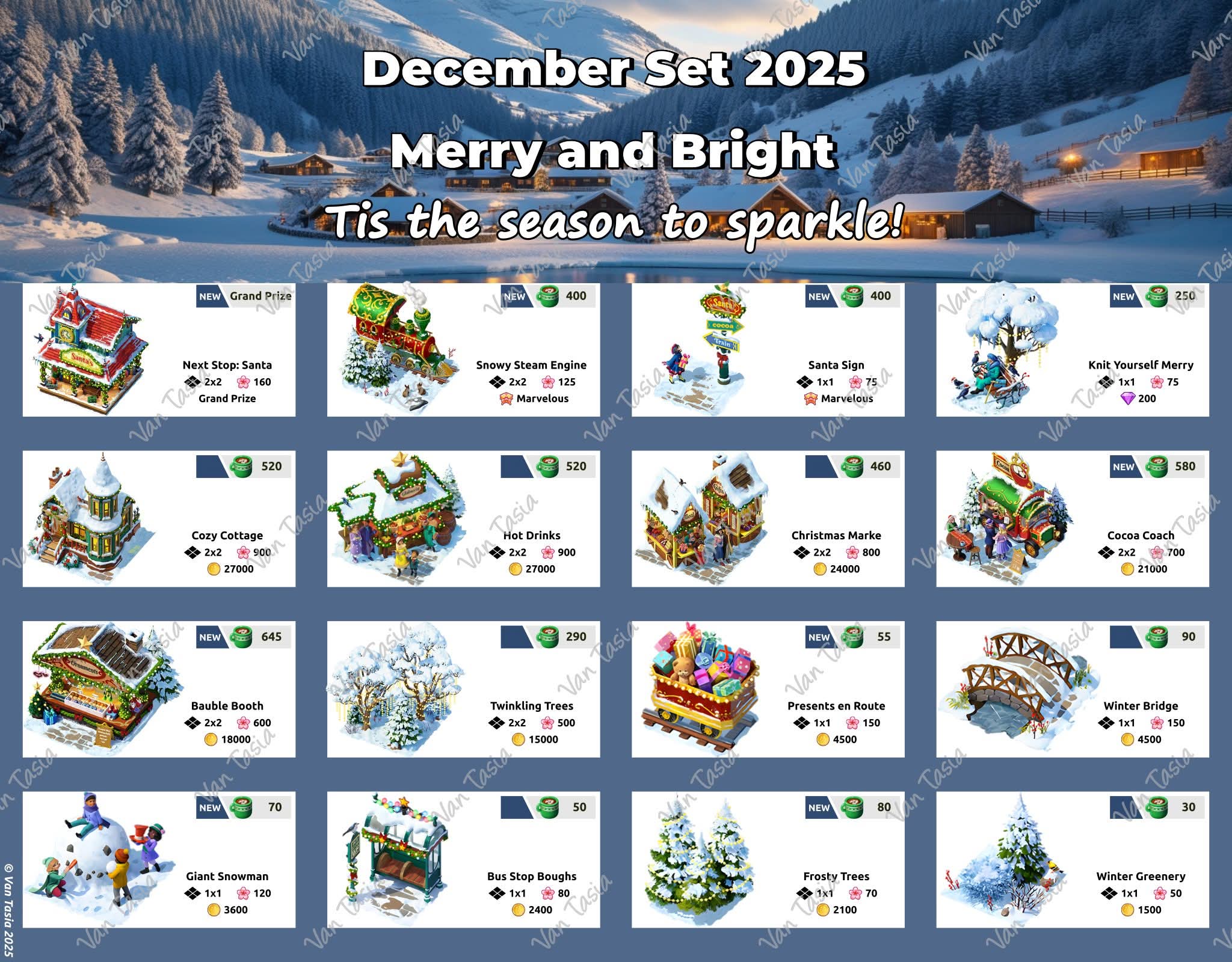 Every month there is a new set from which buildings, figures or items can be purchased